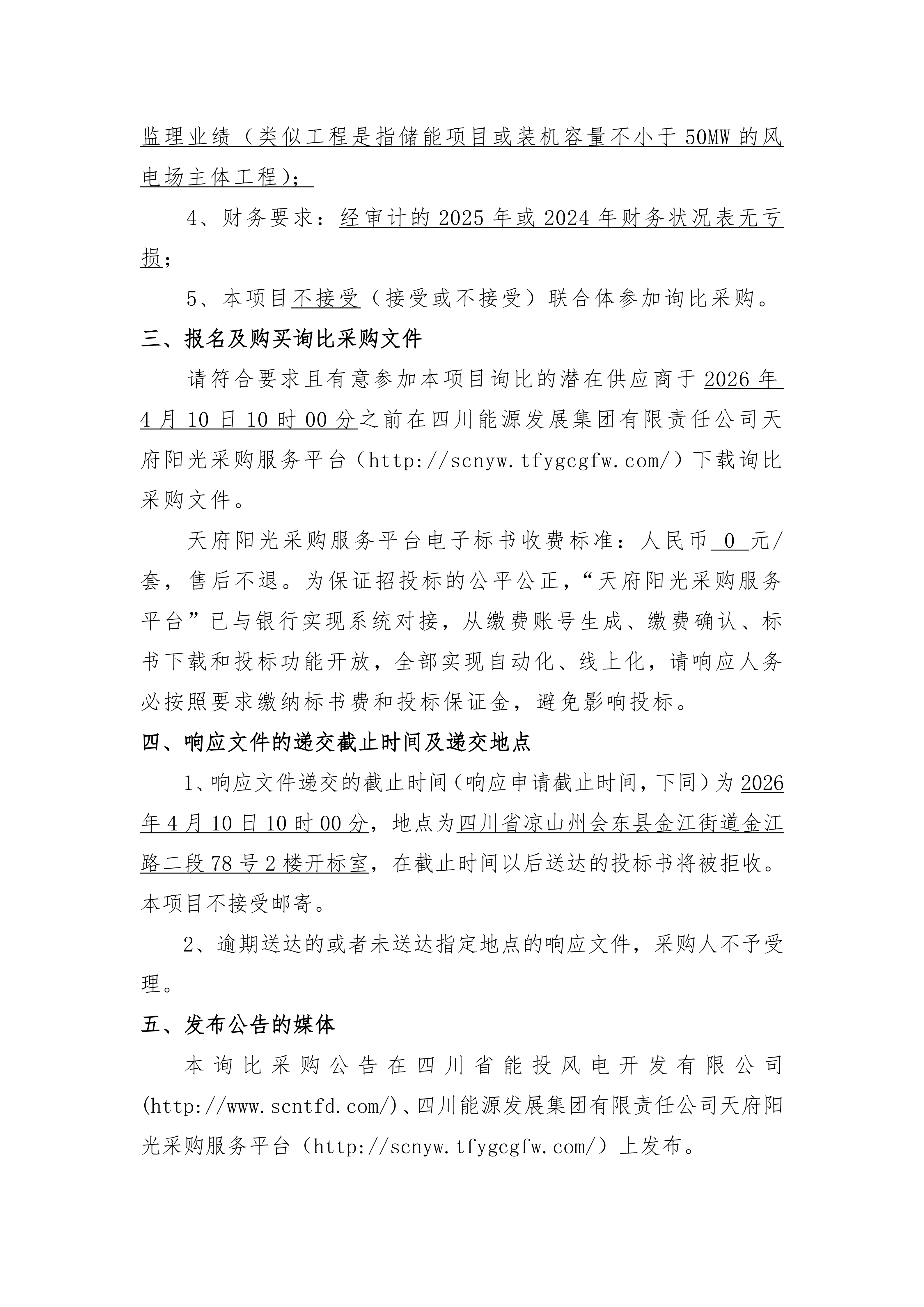 请符合要求且有意参加本项目询比的潜在供应商于2026年4月10日10时00分之前在四川能源发展集团有限责任公司天府阳光采购服务平台(http://scnyw.tfygcgfw.com/)下载询比采购文件。
