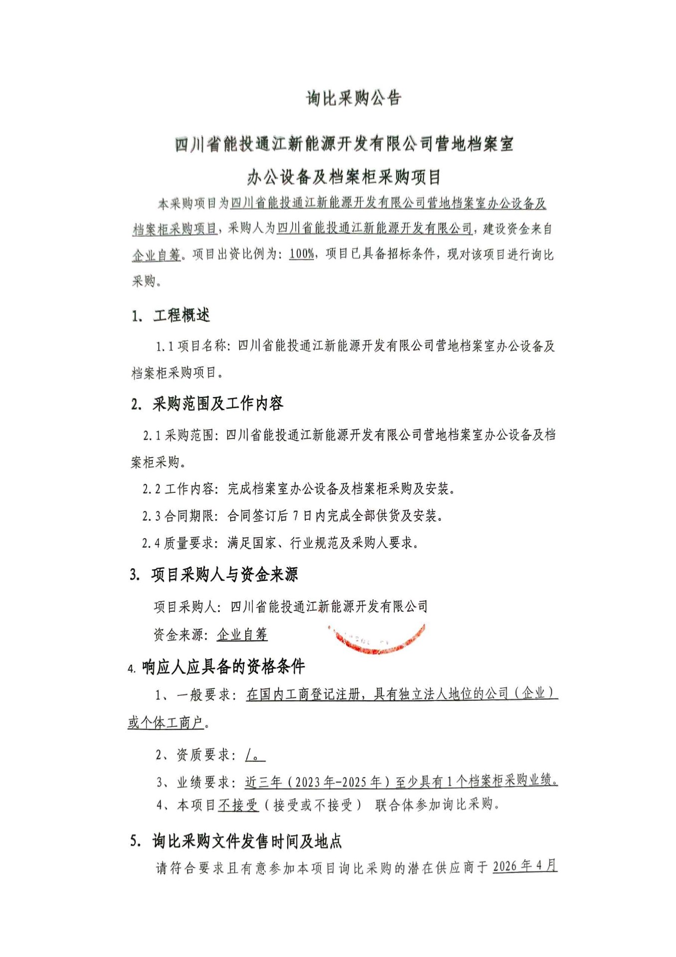 本采购项目为四川省能投通江新能源开发有限公司营地档案室办公设备及档案柜采购项目,采购人为四川省能投通江新能源开发有限公司,建设资金来自企业自筹。项目出资比例为:100%,项目已具备招标条件,现对该项目进行询比采购。