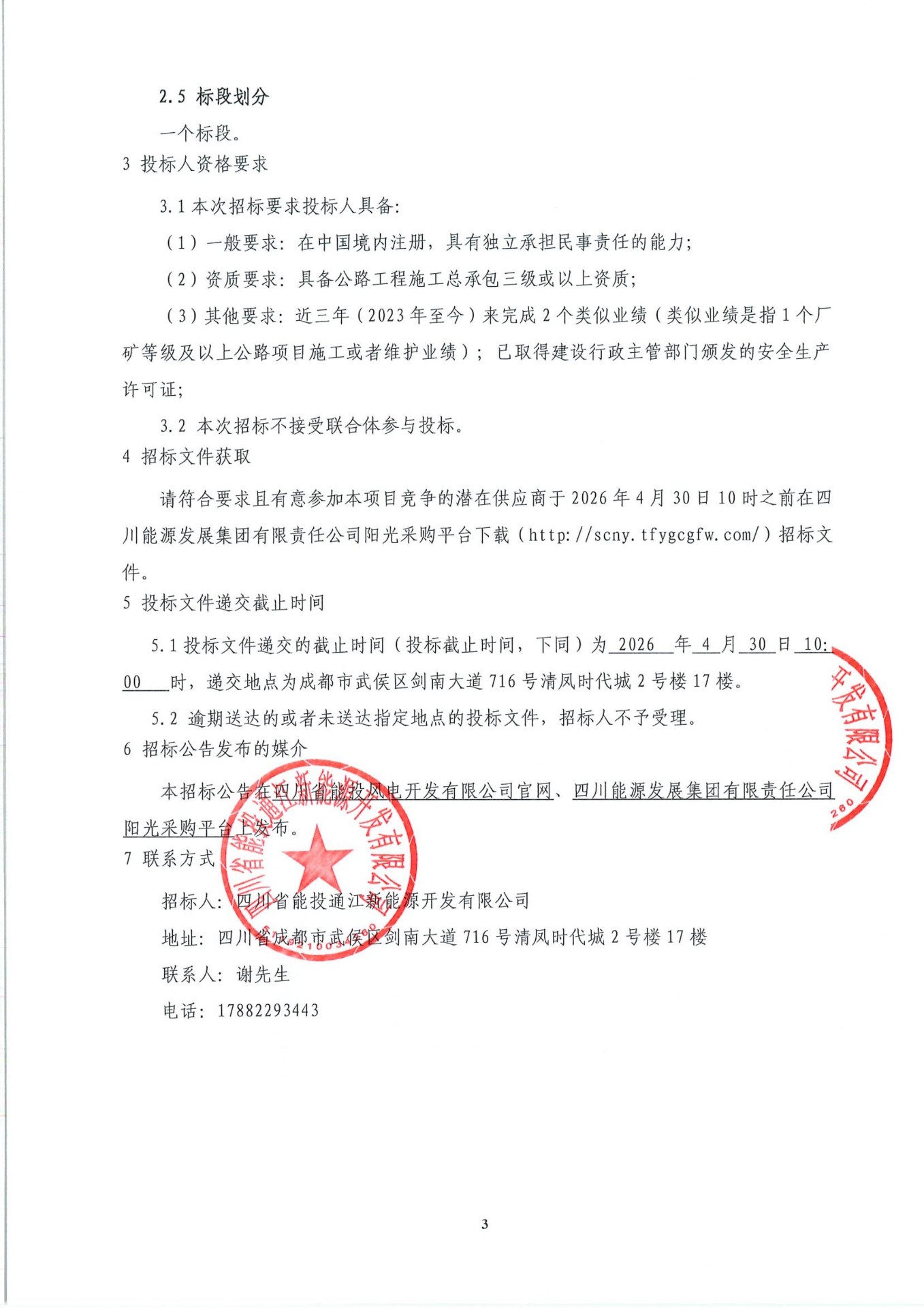 本招标公告在四川省能投风电开发有限公司官网、四川能源发展集团有限责任公司阳光采购平台上发布。