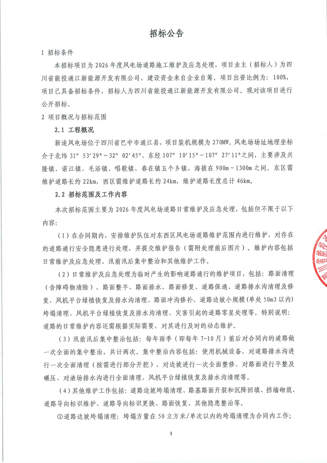 本招标项目为2026年度风电场道路施工维护及应急处理,项目业主(招标人)为四川省能投通江新能源开发有限公司,建设资金来自企业自筹。项目出资比例为:100%,项目已具备招标条件,招标人为四川省能投通江新能源开发有限公司。现对该项目进行公开招标。