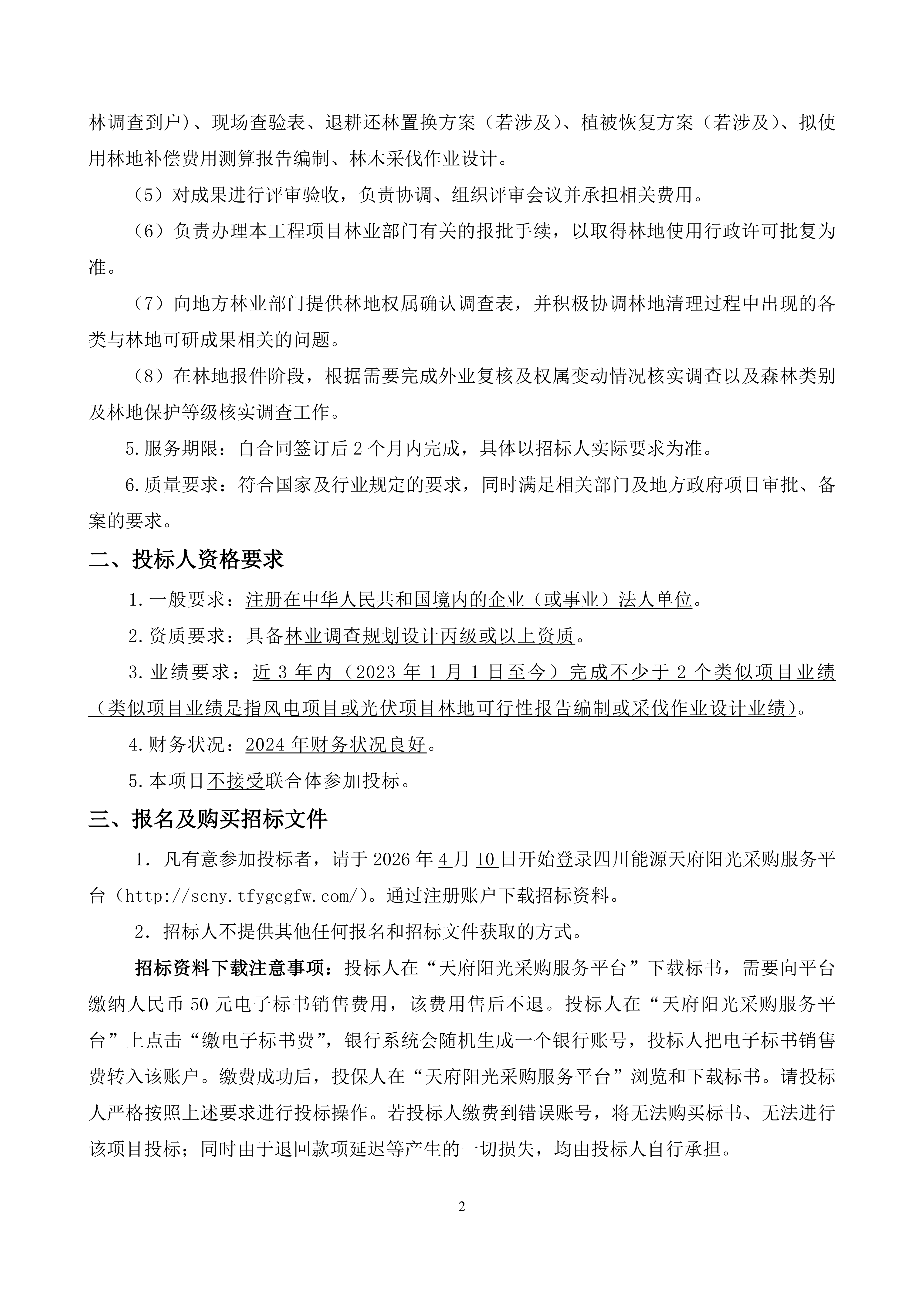 3.业绩要求:近3年内(2023年1月1日至今)完成不少于2个类似项目业绩(类似项目业绩是指风电项目或光伏项目林地可行性报告编制或采伐作业设计业绩)。