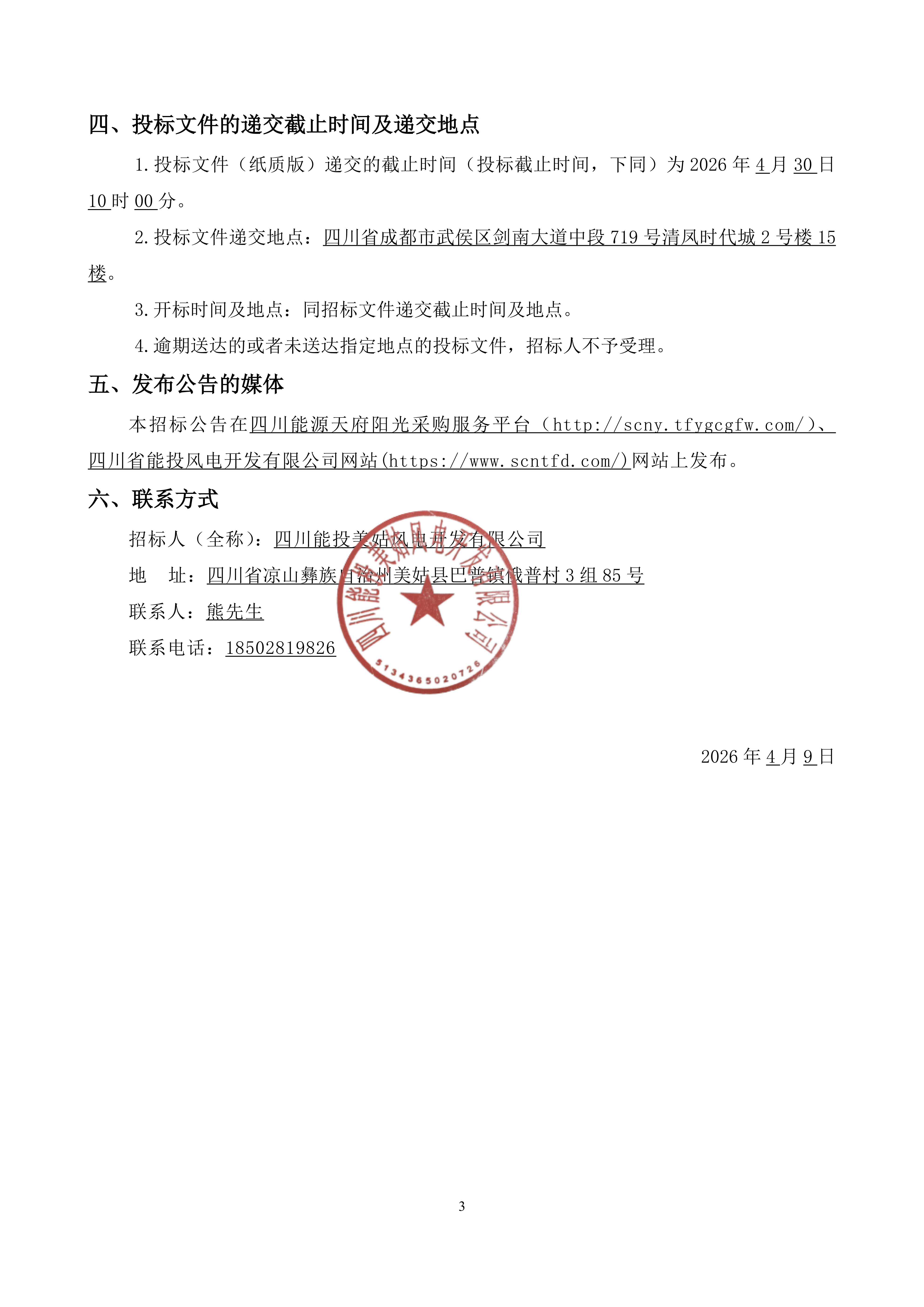 本招标公告在四川能源天府阳光采购服务平台(http://scny.tfygcgfw.com/)、四川省能投风电开发有限公司网站(https://www.scntfd.com/)网站上发布。