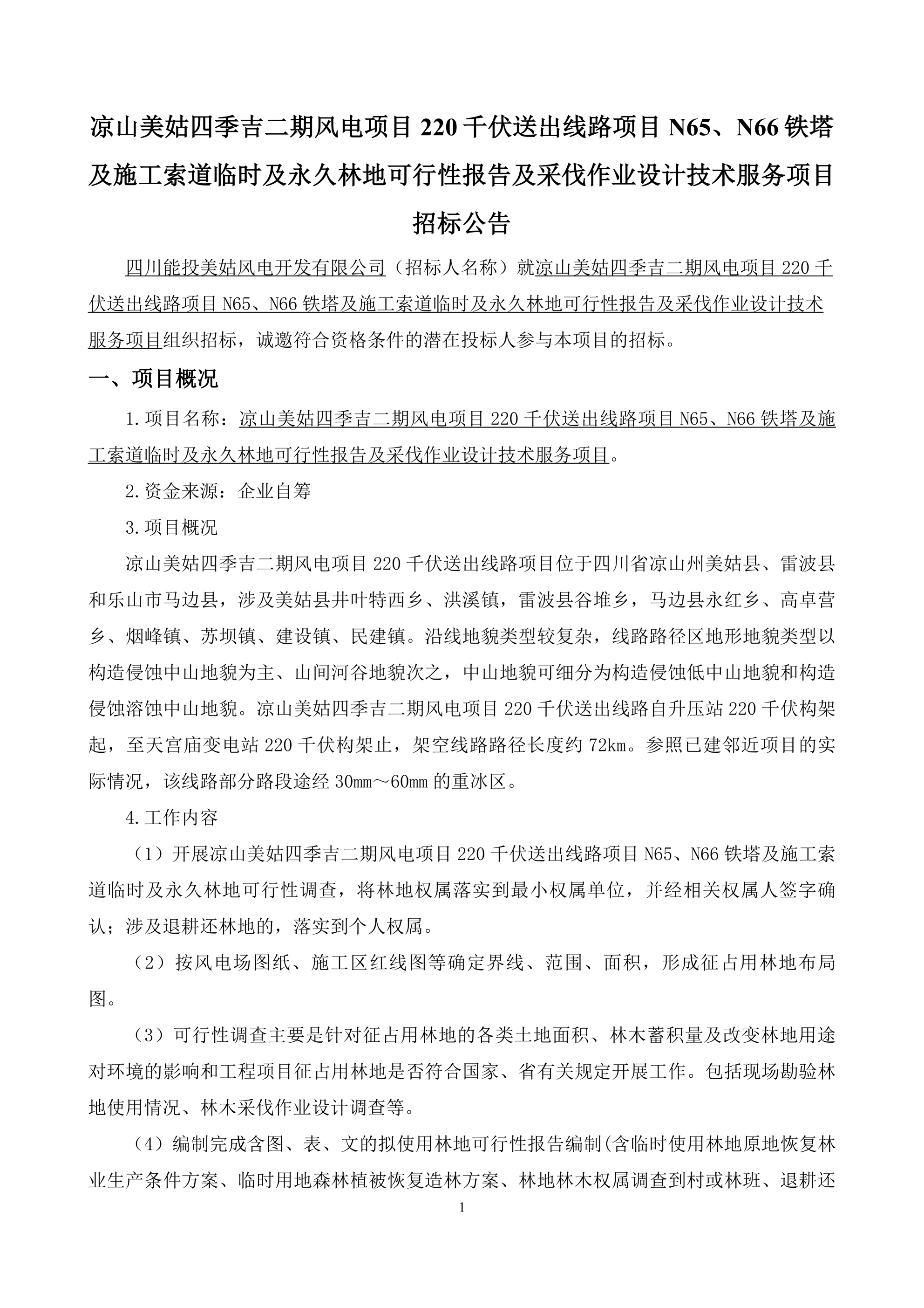 四川能投美姑风电开发有限公司(招标人名称)就凉山美姑四季吉二期风电项目220千伏送出线路项目N65、N66铁塔及施工索道临时及永久林地可行性报告及采伐作业设计技术服务项目组织招标,诚邀符合资格条件的潜在投标人参与本项目的招标。