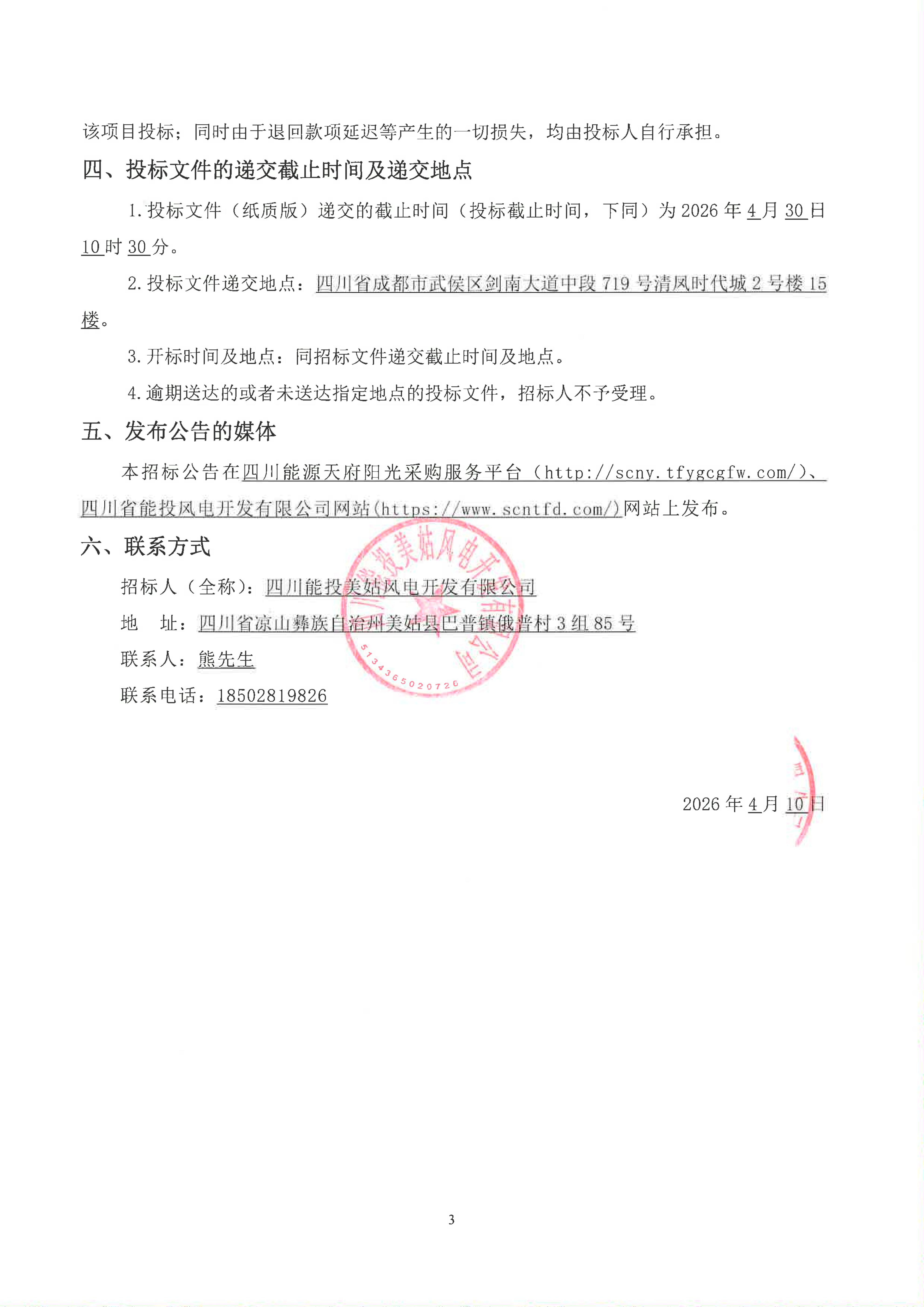 本招标公告在四川能源天府阳光采购服务平台(http://scny.tfygcgfw.com/)、四川省能投风电开发有限公司网站(https://www.scntfd.com/)网站上发布。