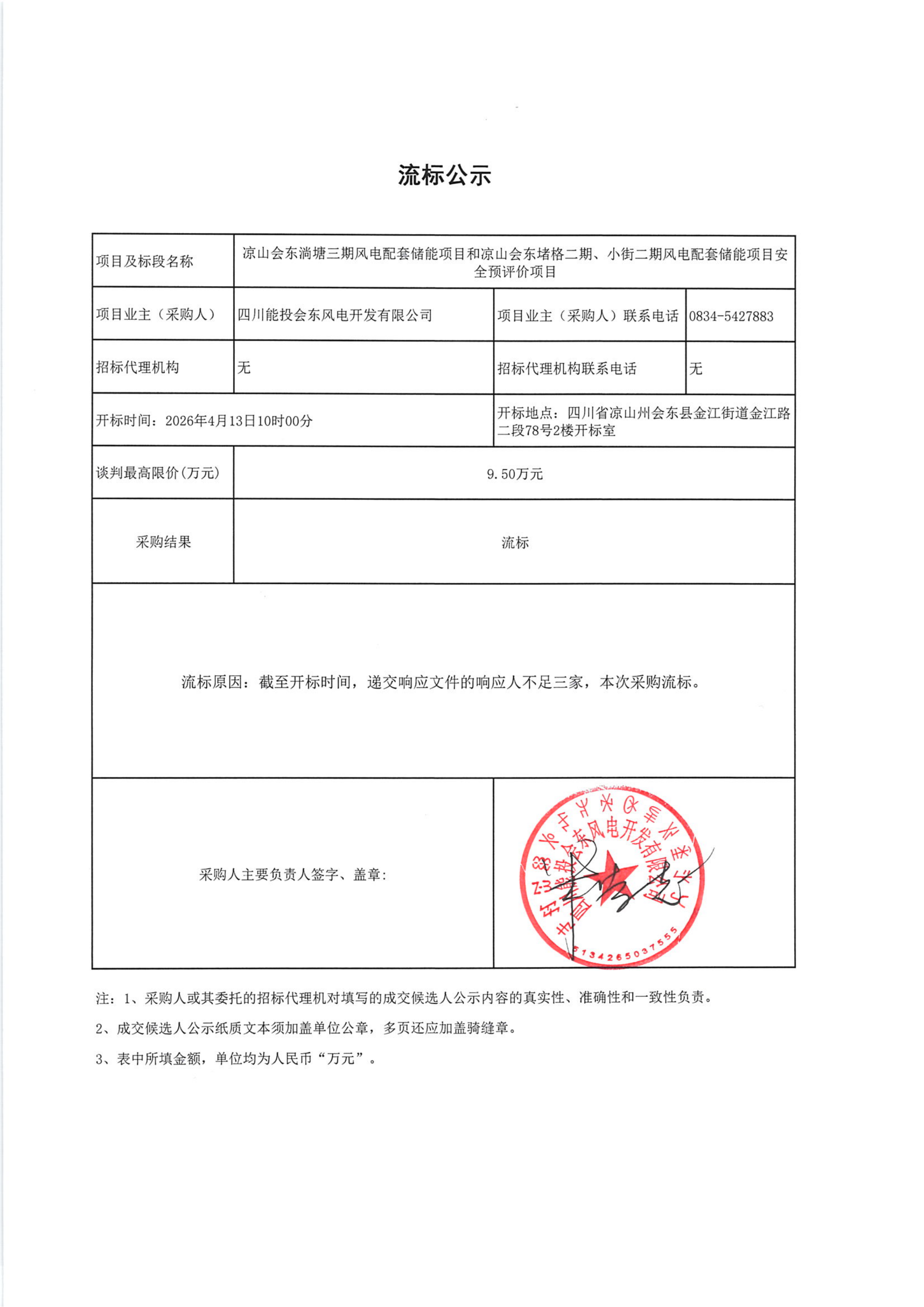 四川能投会东风电开发有限公司关于淌塘三期、堵格二期及小街二期风电配套储能项目安全预评价项目的流标公示