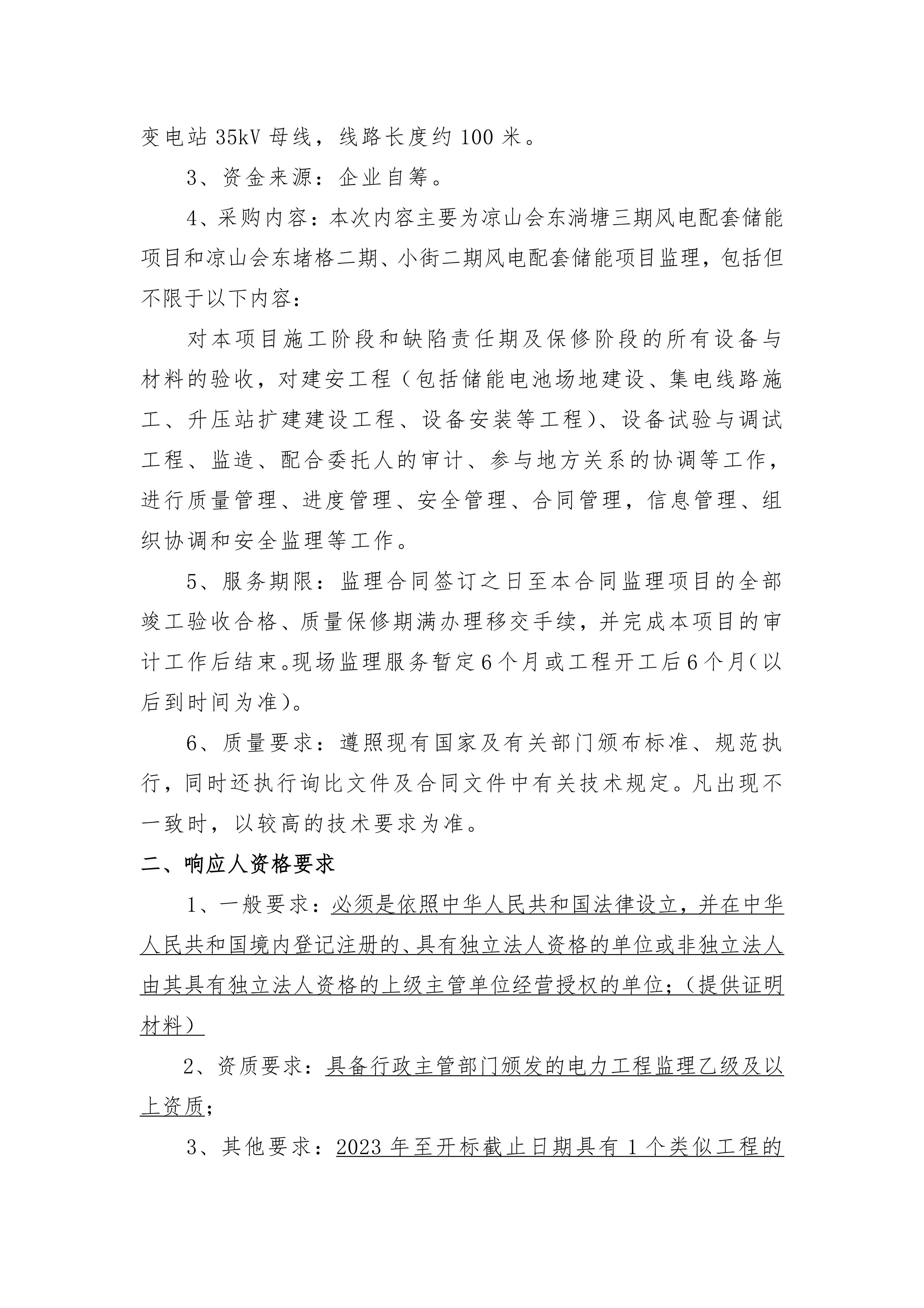 1、项目名称:凉山会东淌塘三期风电配套储能项目和凉山会东堵格二期、小街二期风电配套储能项目监理项目。