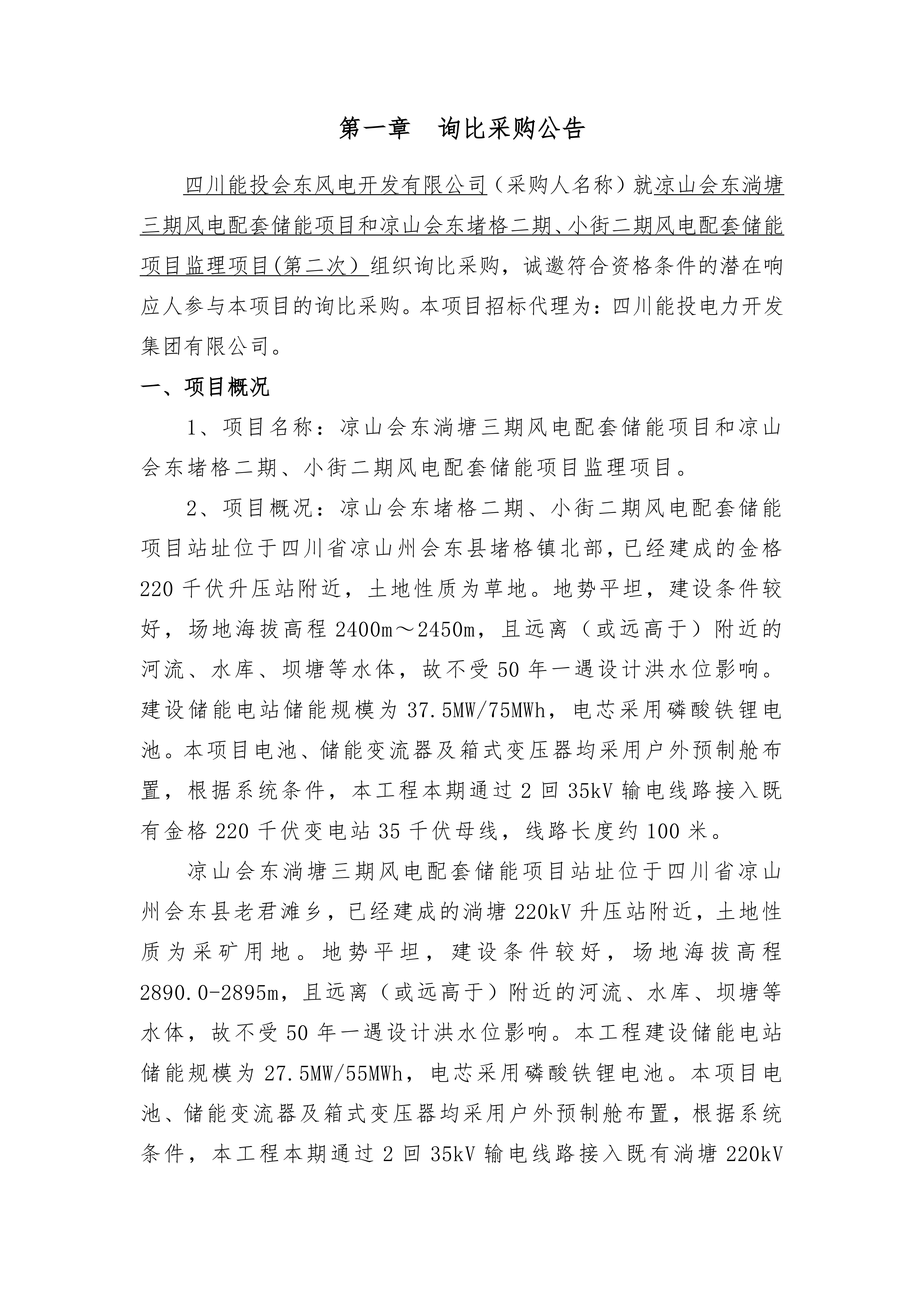 四川能投会东风电开发有限公司(采购人名称)就凉山会东淌塘三期风电配套储能项目和凉山会东堵格二期、小街二期风电配套储能项目监理项目(第二次)组织询比采购,诚邀符合资格条件的潜在响应人参与本项目的询比采购。本项目招标代理为:四川能投电力开发集团有限公司。