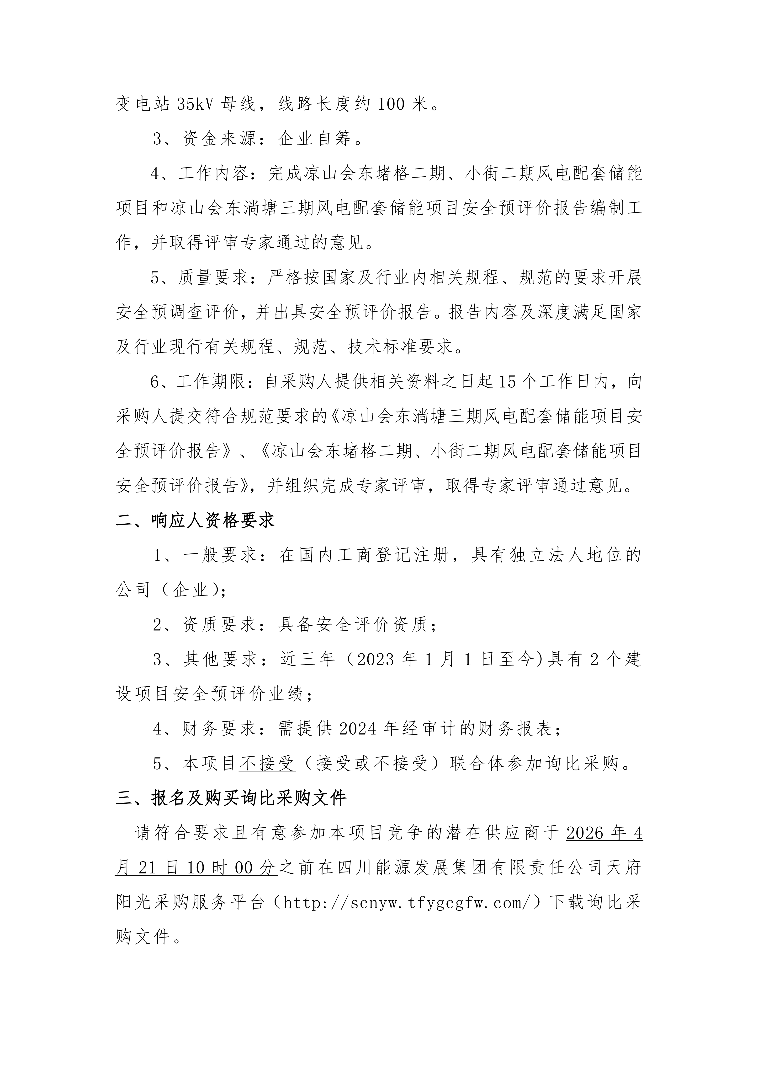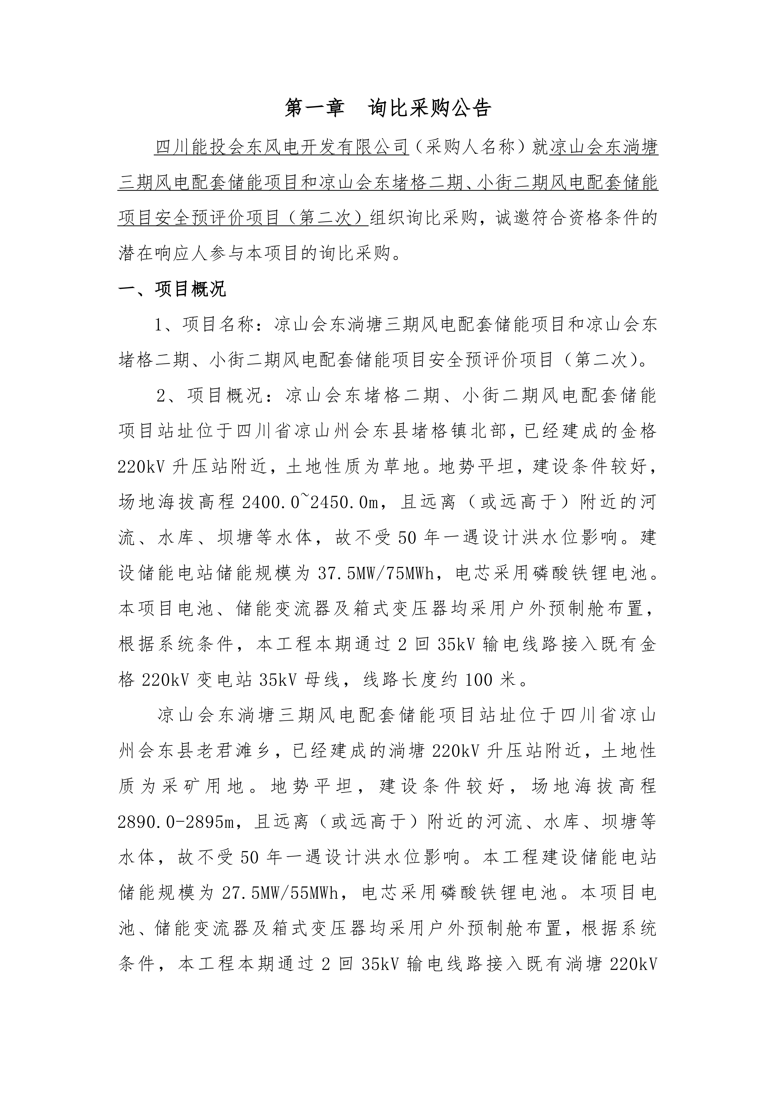 四川能投会东风电开发有限公司(采购人名称)就凉山会东淌塘三期风电配套储能项目和凉山会东堵格二期、小街二期风电配套储能项目安全预评价项目(第二次)组织询比采购,诚邀符合资格条件的潜在响应人参与本项目的询比采购。