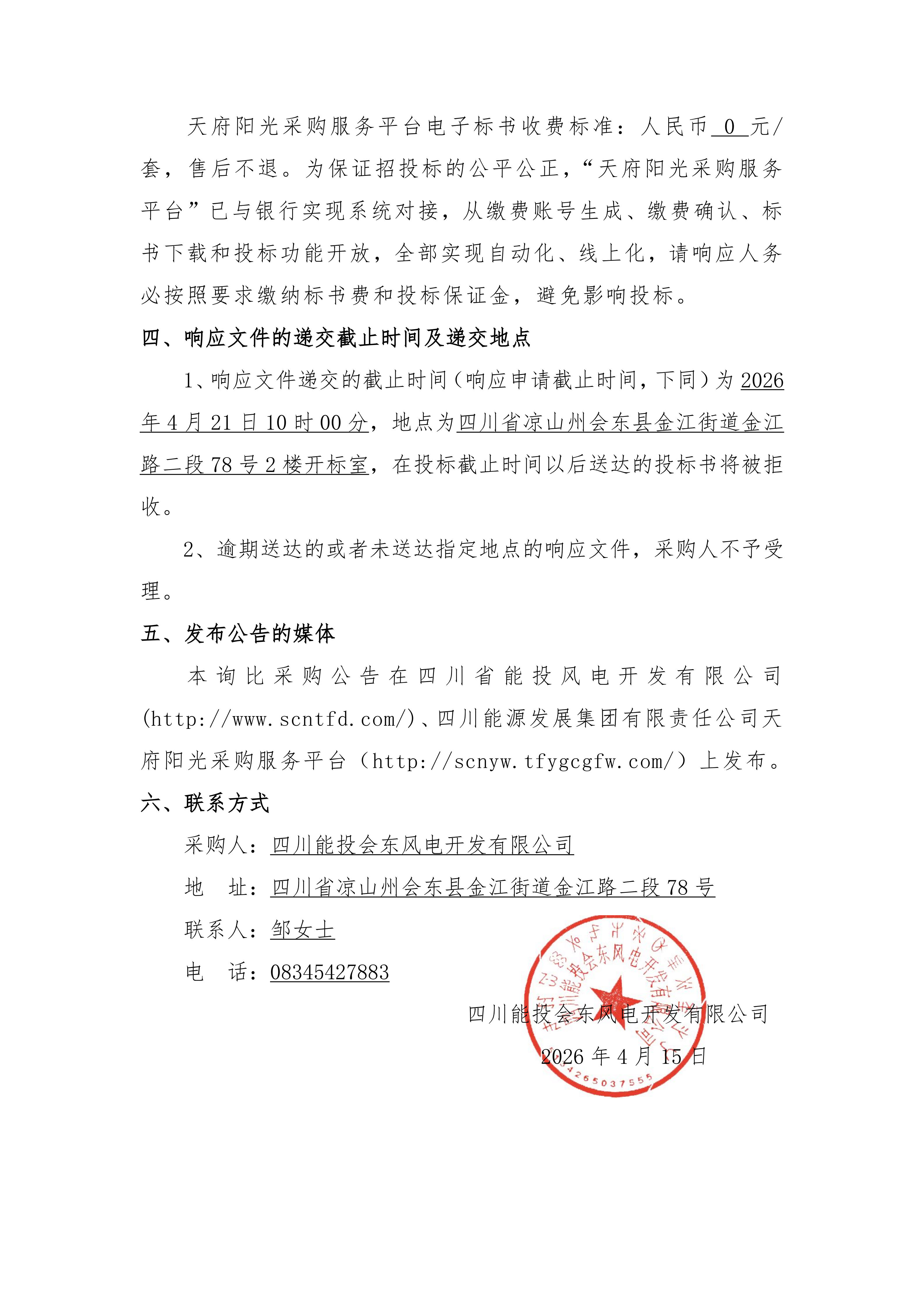 请符合要求且有意参加本项目竞争的潜在供应商于2026年4月21日10时00分之前在四川能源发展集团有限责任公司天府阳光采购服务平台(http://scnyw.tfygcgfw.com/)下载询比采购文件。