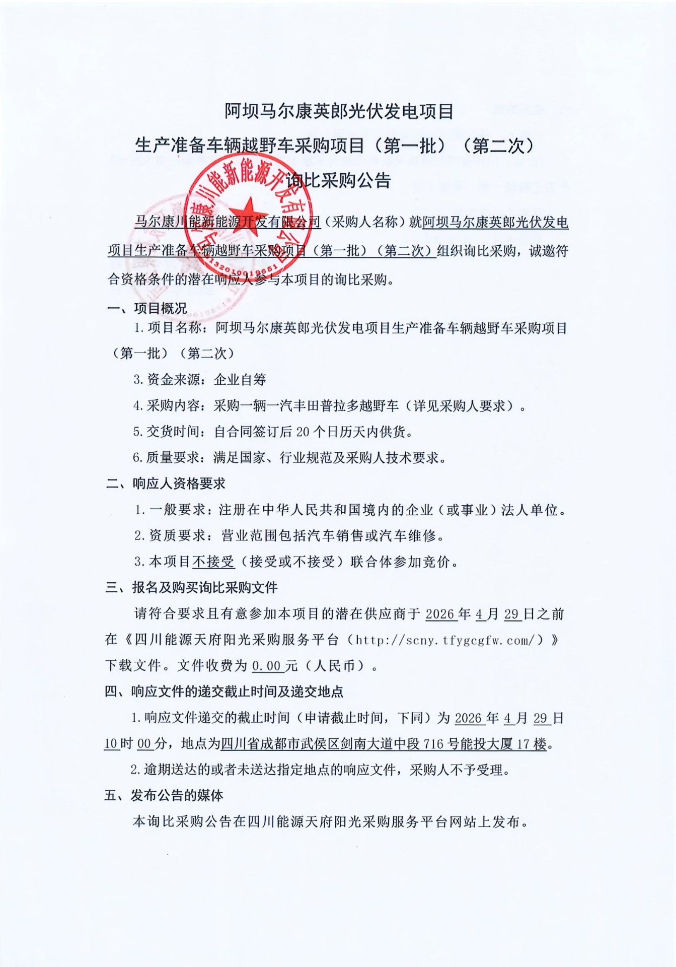马尔康川能新能源开发有限公司(采购人名称)就阿坝马尔康英郎光伏发电项目生产准备车辆越野车采购项目(第一批)组织询比采购,诚邀符合资格条件的潜在响应人参与本项目的询比采购。