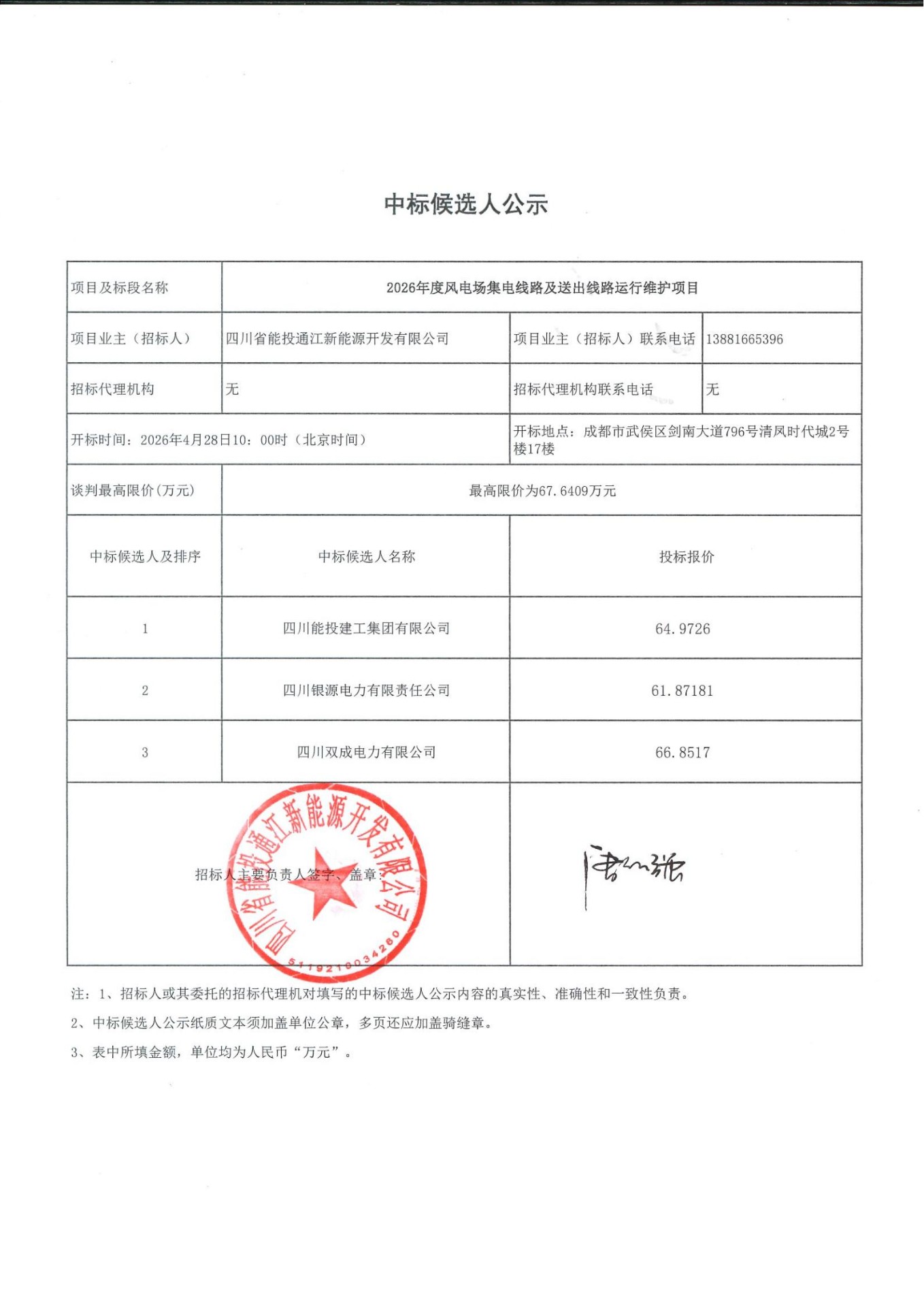 四川省能投通江新能源开发有限公司关于2026年度风电场集电线路及送出线路运行维护项目的中标候选人公示