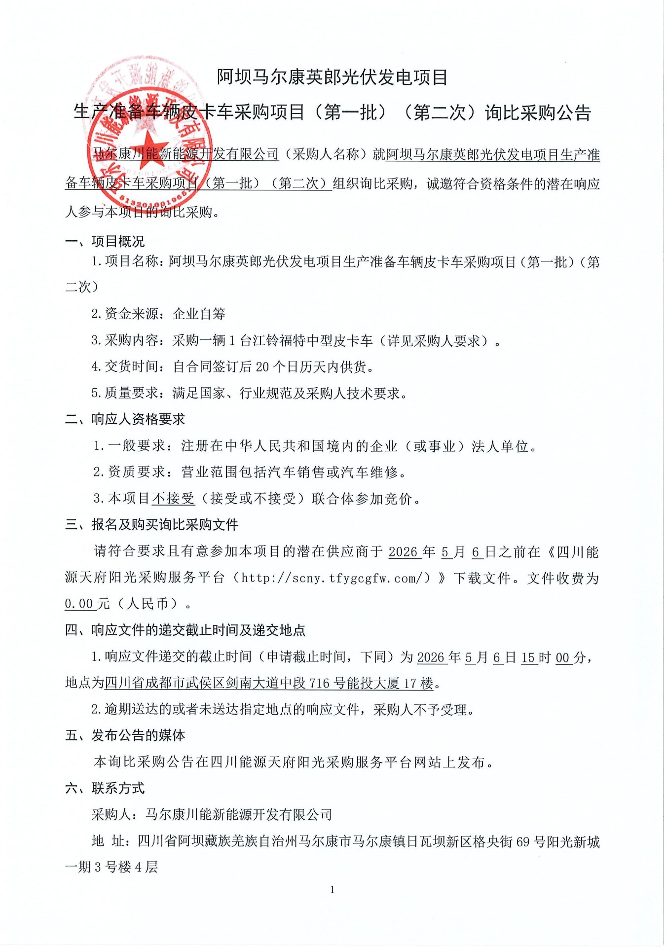 马尔康川能新能源开发有限公司(采购人名称)就阿坝马尔康英郎光伏发电项目生产准备车辆皮卡车采购项目(第一批)(第二次)组织询比采购,诚邀符合资格条件的潜在响应人参与本项目的询比采购。